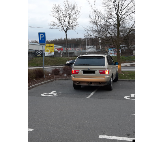 Značka/model: BMW/X5 Město: Kladno Ulice: parkoviště Tesco Komentář autora: Nevesel se ani na misto pro invalidy. Cca 30 letej ridic, ne-vozickar, co si potreboval rychle odskocit nakoupit