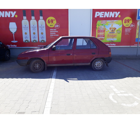 Značka/model: Škoda/Favorit Město: Náchod Ulice: Pražská Komentář autora: I tak se dá parkovat před Penny Marketem v Náchodě