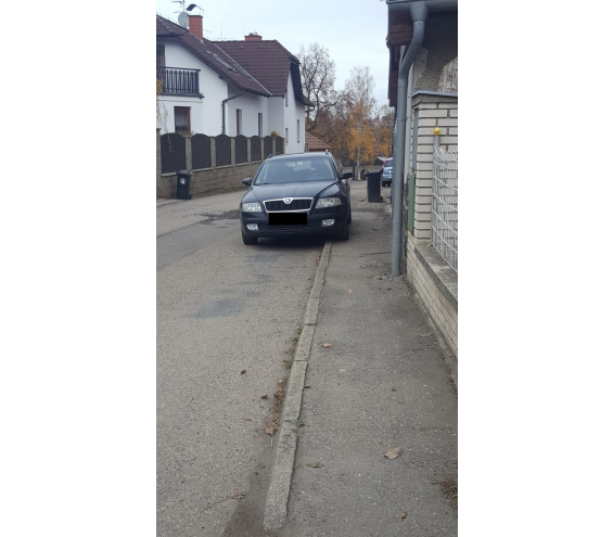 Značka/model: Škoda/Octavia Město: - Ulice: Obec Netvořice, ulice Neveklovská Komentář autora: Majitelka úmyslně takto parkuje, aby dle jejího názoru zlepšila bezpečnost provozu, tím že vozidla musí zpomalit. Úmyslně omezuje a ohrožuje účastníky silničního provozu a dále ohrožuje chodce s kočárky, kteří musí vozidlo obejít po silnici. Policie nekoná a často kolem bez povšimnutí projedou. Pomáhat a chránit v praxi.