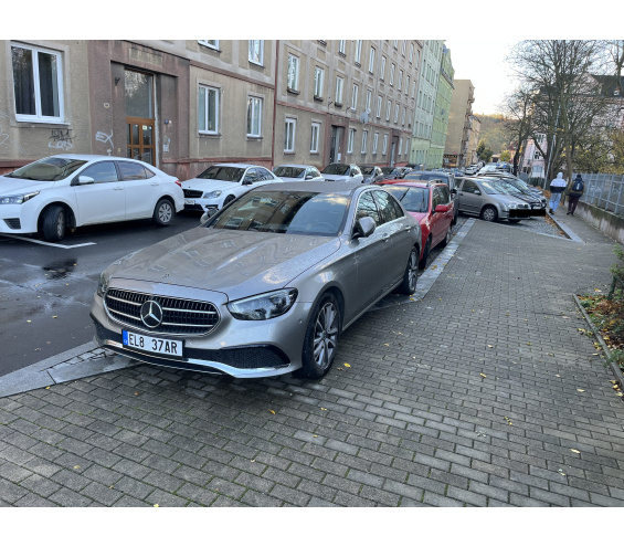 Značka/model: Mercedes-Benz/E 300 Město: Karlovy Vary Ulice: Majakovského Komentář autora: Nejen že parkuje na chodníku, ale zablokuje auto za ním. Asi malý péro…
